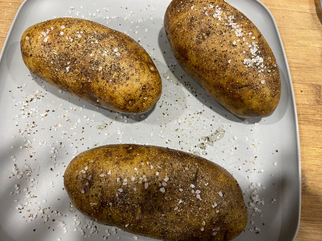 I am not a fan of baked potatoes cooked in the microwave, so I like to cook mine in the air fryer. This recipe is so simple to make. You will need the following ingredients: