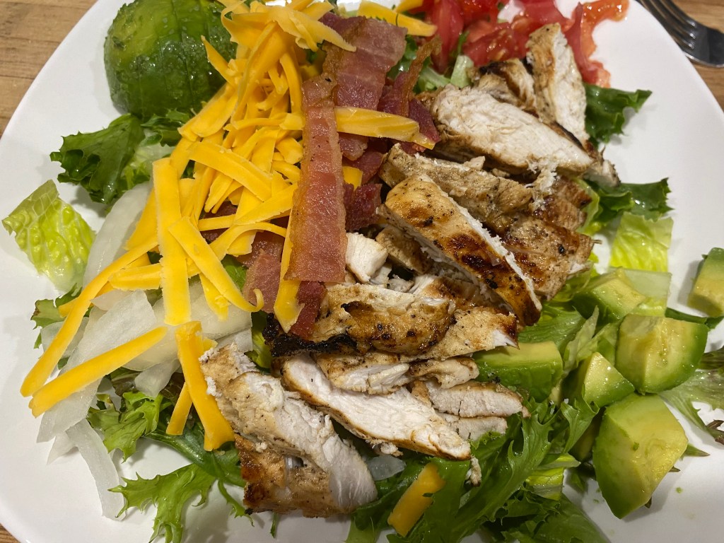 Then I lay the chicken breast down the center of the lettuce and I add the cheese on one side and then the bacon. On the other side I add the sliced onions. You can serve this salad anyway you would like though.