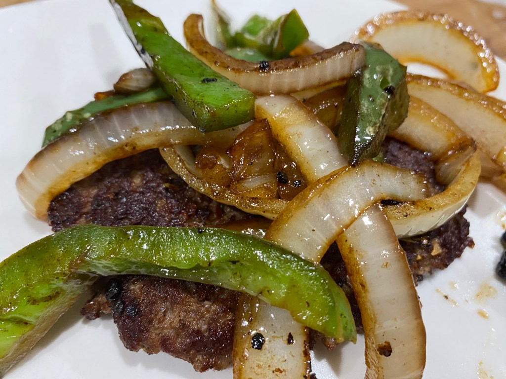 Place the chopped steaks onto a serving platter or plate and top them with the sauteed peppers and onions. Enjoy!