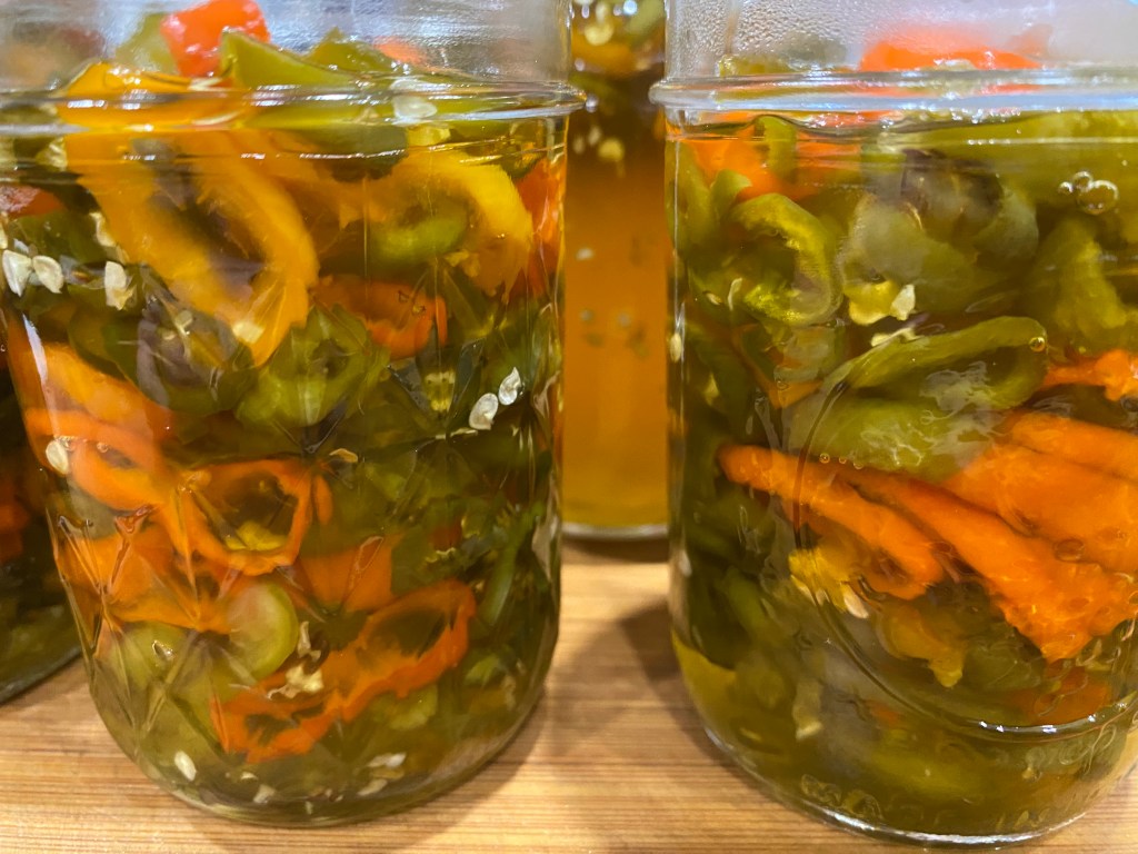 Turn the heat off and begin adding the peppers to the jars and then cover the peppers with the liquid leaving 1 inch headspace.