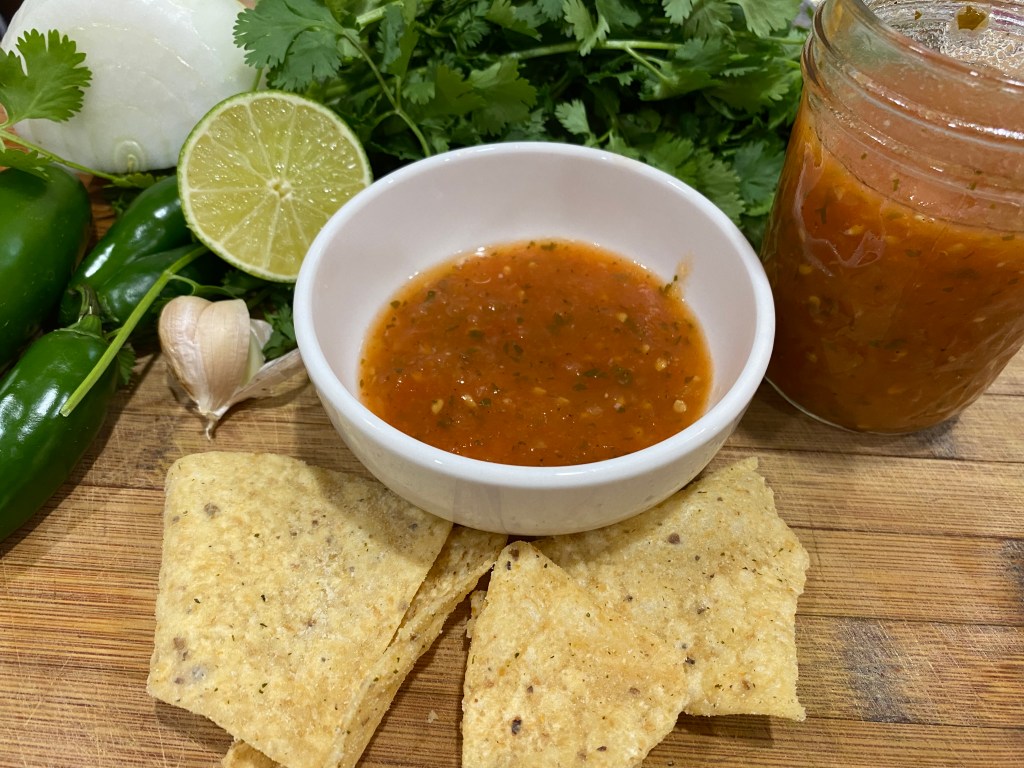 I like to use an immersion blender to blend my salsa into a smooth consistency but you can leave it chunky if you prefer.