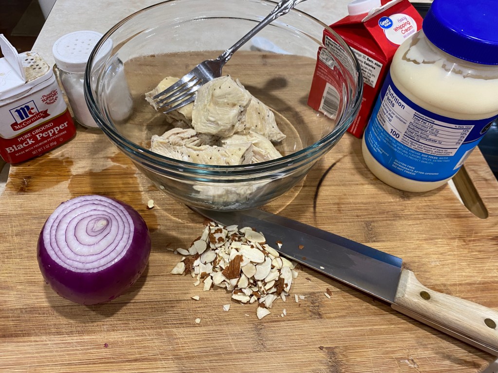 Shred up the chicken into small pieces and add the onion, almonds, mayonnaise, heavy whipping cream and salt and pepper to a bowl and mix really well. Refrigerate until cold. Enjoy!