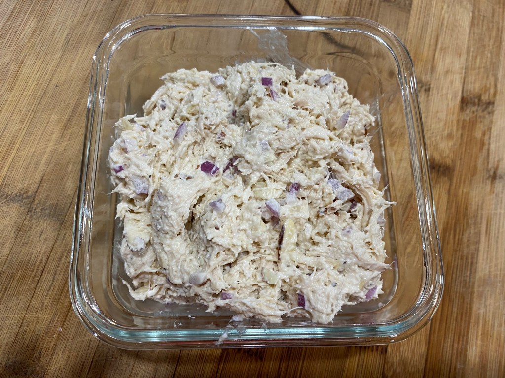 Start by boiling the chicken in water until it is done. You can use the Instant Pot or Crockpot to do this too. Take the chicken out of the water and let it cool. In the meantime dice up the red onion in pretty small pieces.