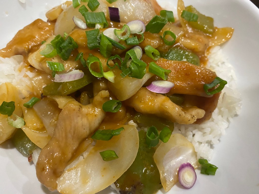 We enjoy this sweet and sour pork served on a bed of jasmine rice.