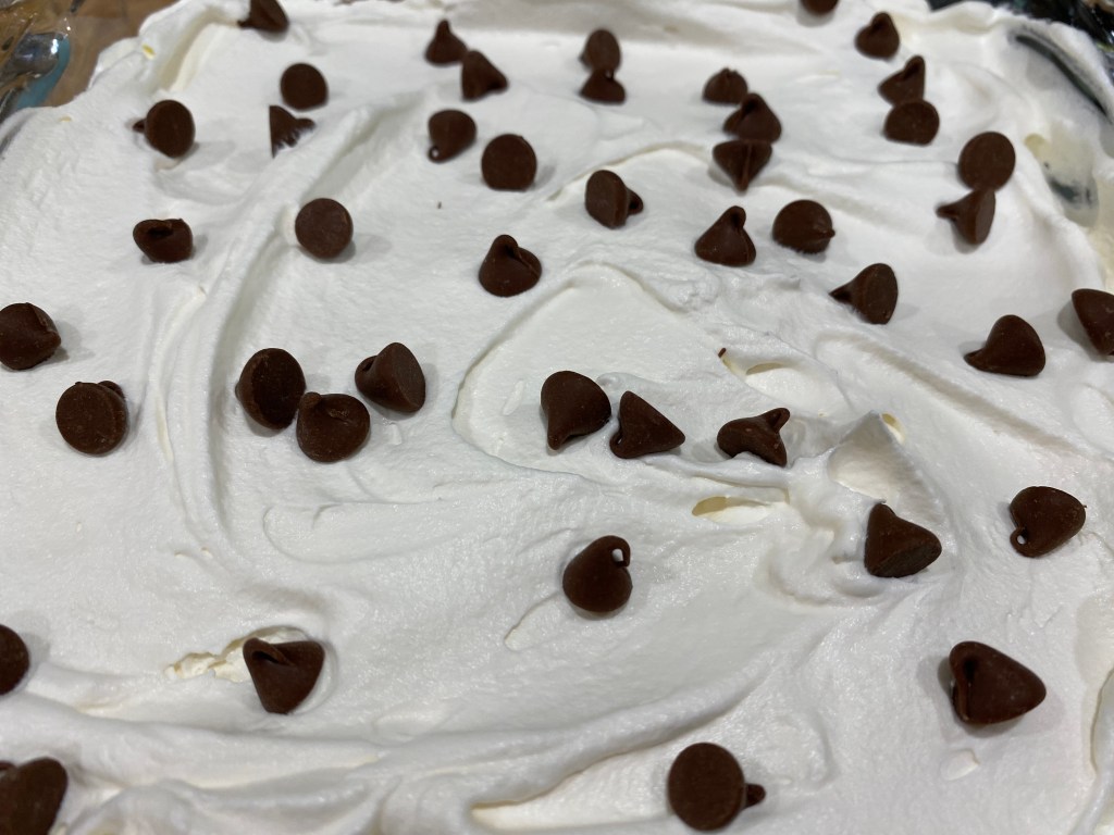 Cover this with the thawed cool whip and a sprinkling of chocolate chips and refrigerate for at least 30 minutes. Enjoy!
