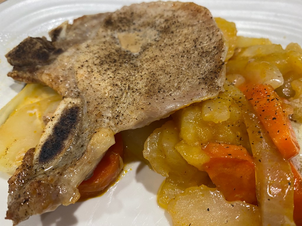 Bake this in the oven until the vegetables are tender and the pork chops are done. This should take around 45 – 60 minutes. Cook time will vary according to how thick the vegetables and the pork chops are.