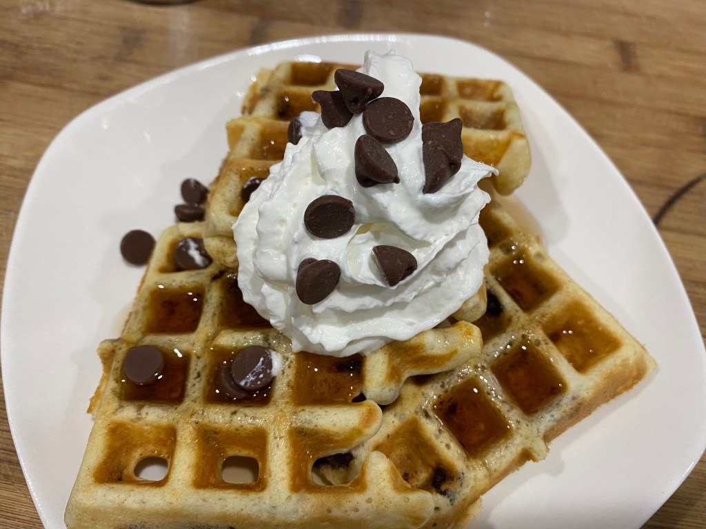 Add in the flour and mix again. Then stir in the chocolate chips. Make sure not to over mix the waffle batter because this will make your waffles tough.