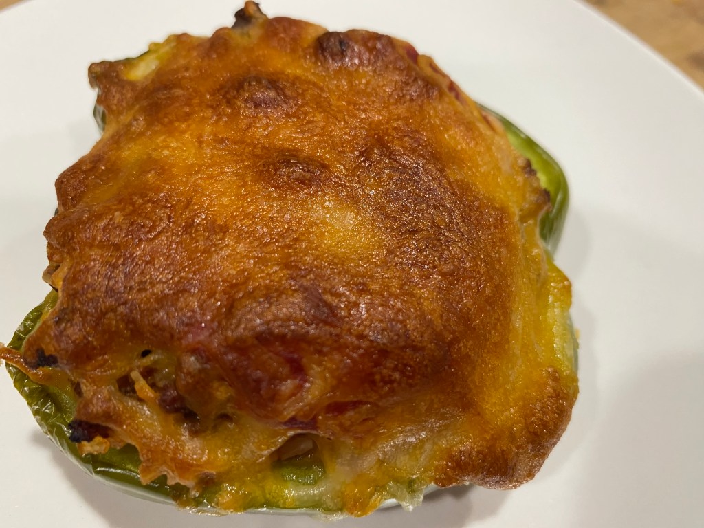 Then add a handful of cheese to the top of the peppers. Place the peppers in the oven and bake for 40 – 45 minutes. Check on them after 25 minutes or so and if the cheese is getting too brown, loosely cover the peppers with a piece of foil. I spray mine with cooking spray to keep the cheese from sticking to it.