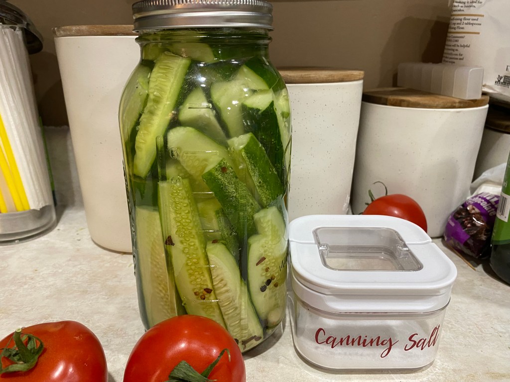 Note: You can make these pickles in a gallon jar just double the recipe. But remember these have to be placed into the refrigerator as they are not sealed so whatever size jar you use make sure they will fit.