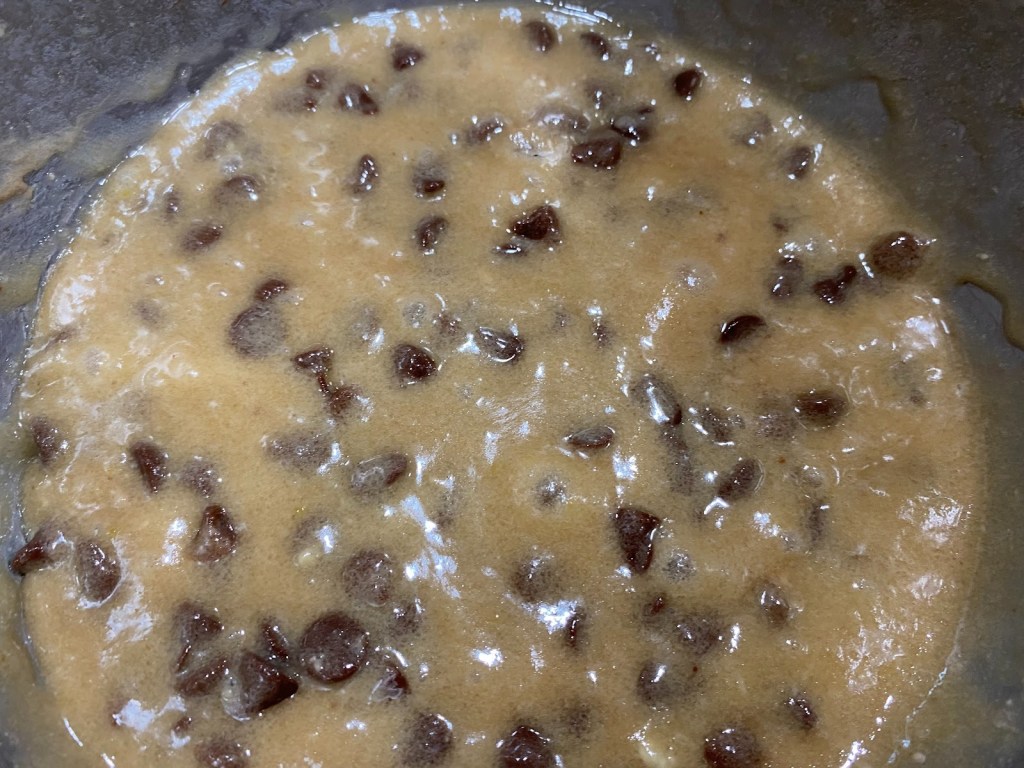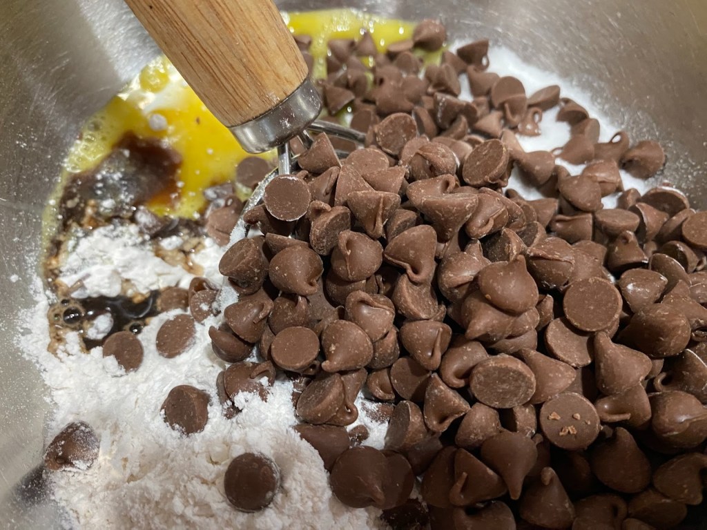 Add the flour, sugar, chocolate chips, vanilla and melted butter.
