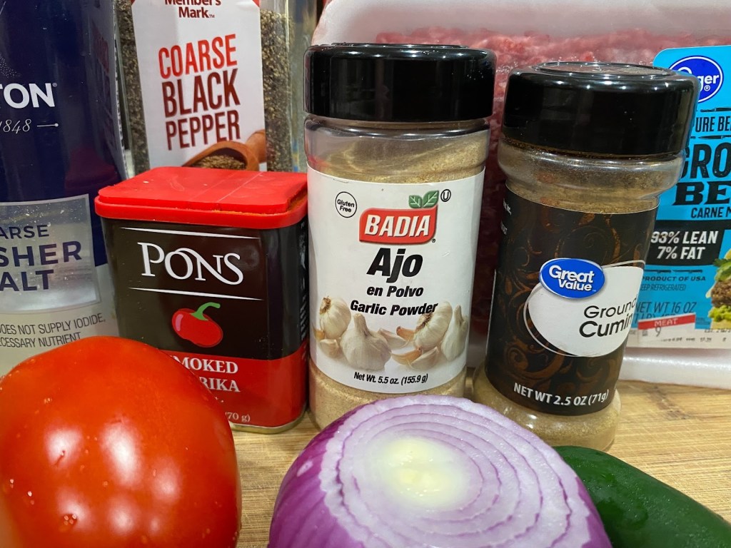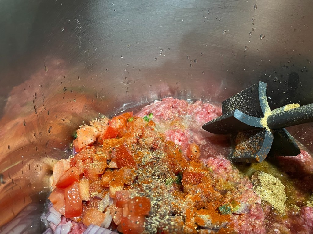 Then add the tomatoes, onions, jalapeno, salt,pepper, paprika, garlic powder and cumin and stir this into the ground beef.
